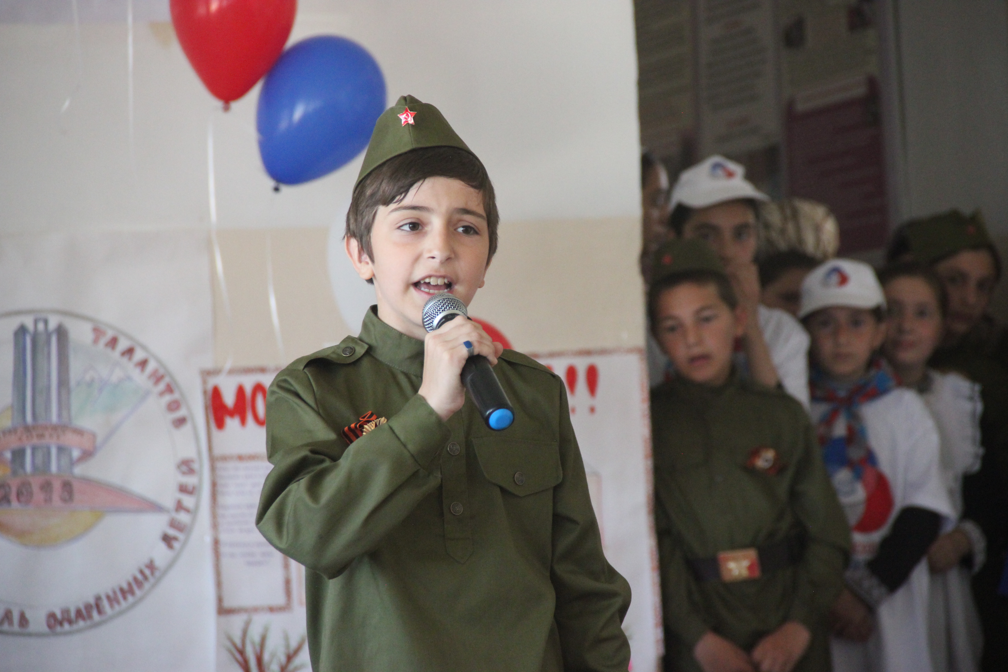 Зрители бурными аплодисментами встретили участника «Российского движения школьников», ученика 5 б класса Магомедарифа Курбанова. Он исполнил песню "Вперед, Россия!"