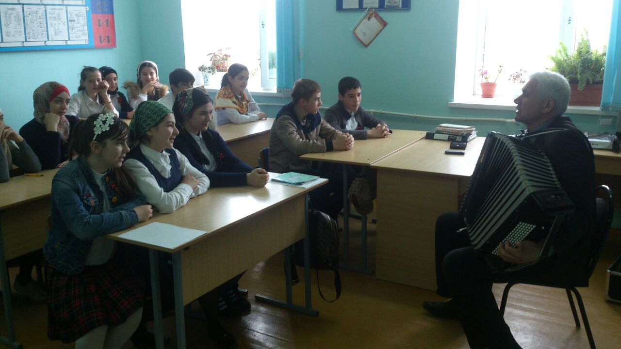 Звучали песни «Смело мы в бой пойдем», «Щорс» и другие. К. Абдулаев поведал школьникам о рождении песен, характере времени, ответил на их вопросы.