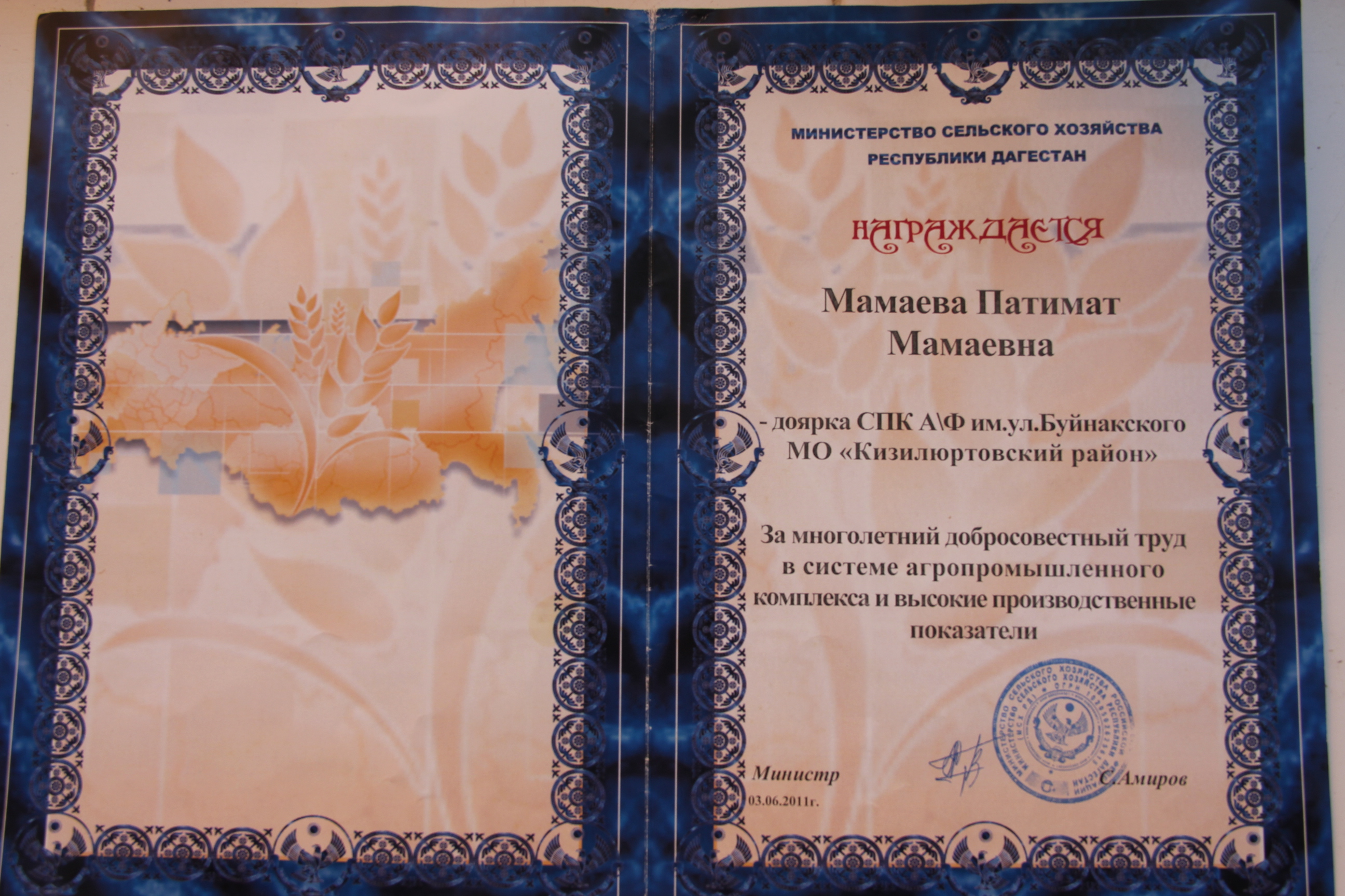 Работа, ставшая уже большей частью ее жизни, и ранее приносила Мамаевой признательность. В 2011 году за многолетний добросовестный труд в системе агропромышленного комплекса и высокие производственные показатели доярку удостоили Почетной грамотой Министерства сельского хозяйства РД.