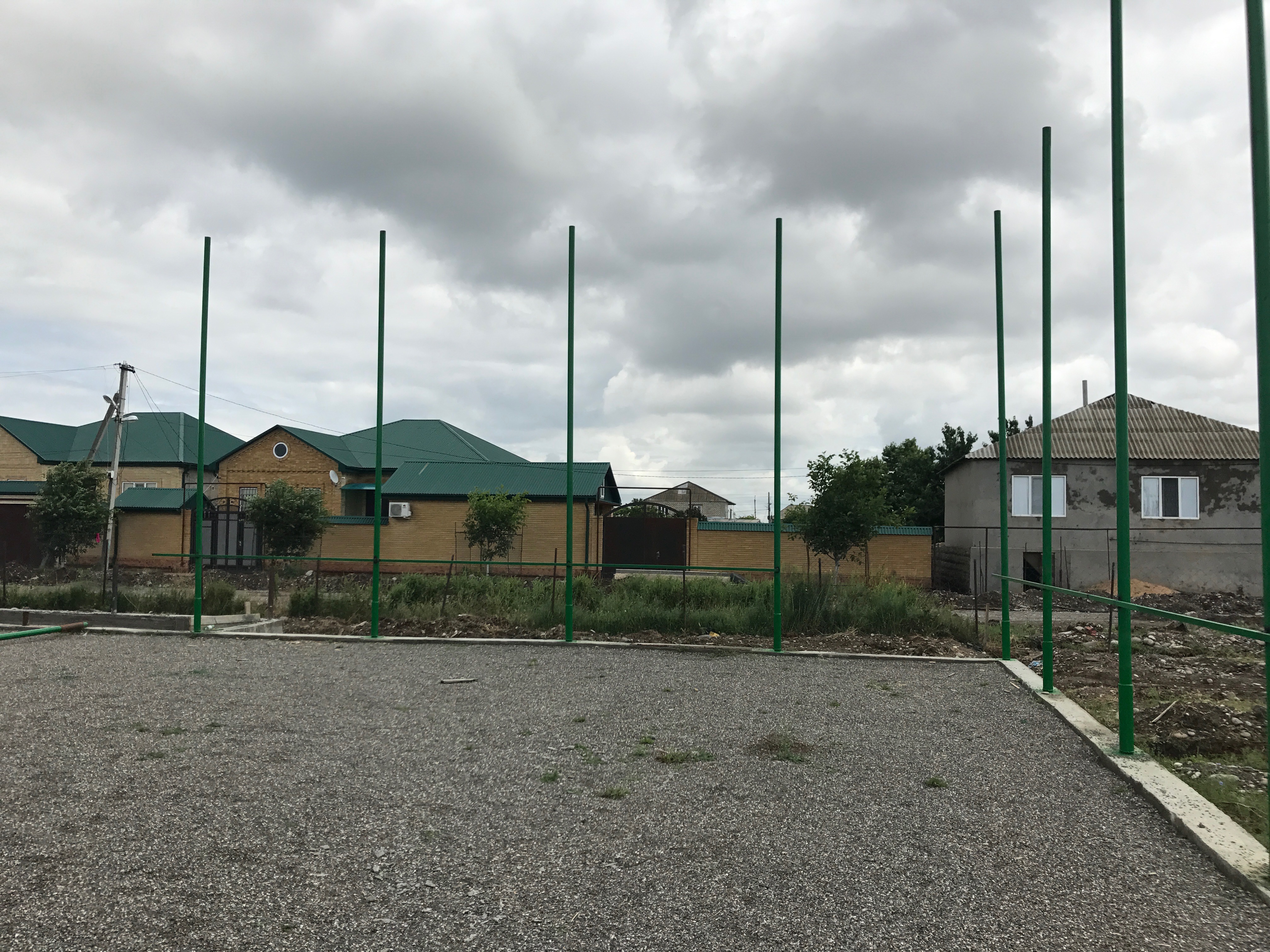 На момент посещения пускового объекта здесь шла подготовка металлической конструкции для огорожения мини - футбольного поля.