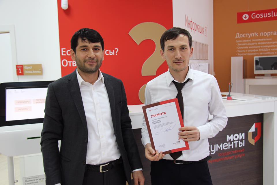 Директор центра "Мои Документы" по Кизилюртовскому району Адиль Аджаматов 27 октября, на очередном совещании коллектива, поздравил специалиста Тимура Абдуллаева с профессиональным успехом. По итогам работы за 3 квартал Абдуллаев признан лучшим специалистом среди филиалов ГАУ МФЦ РД.