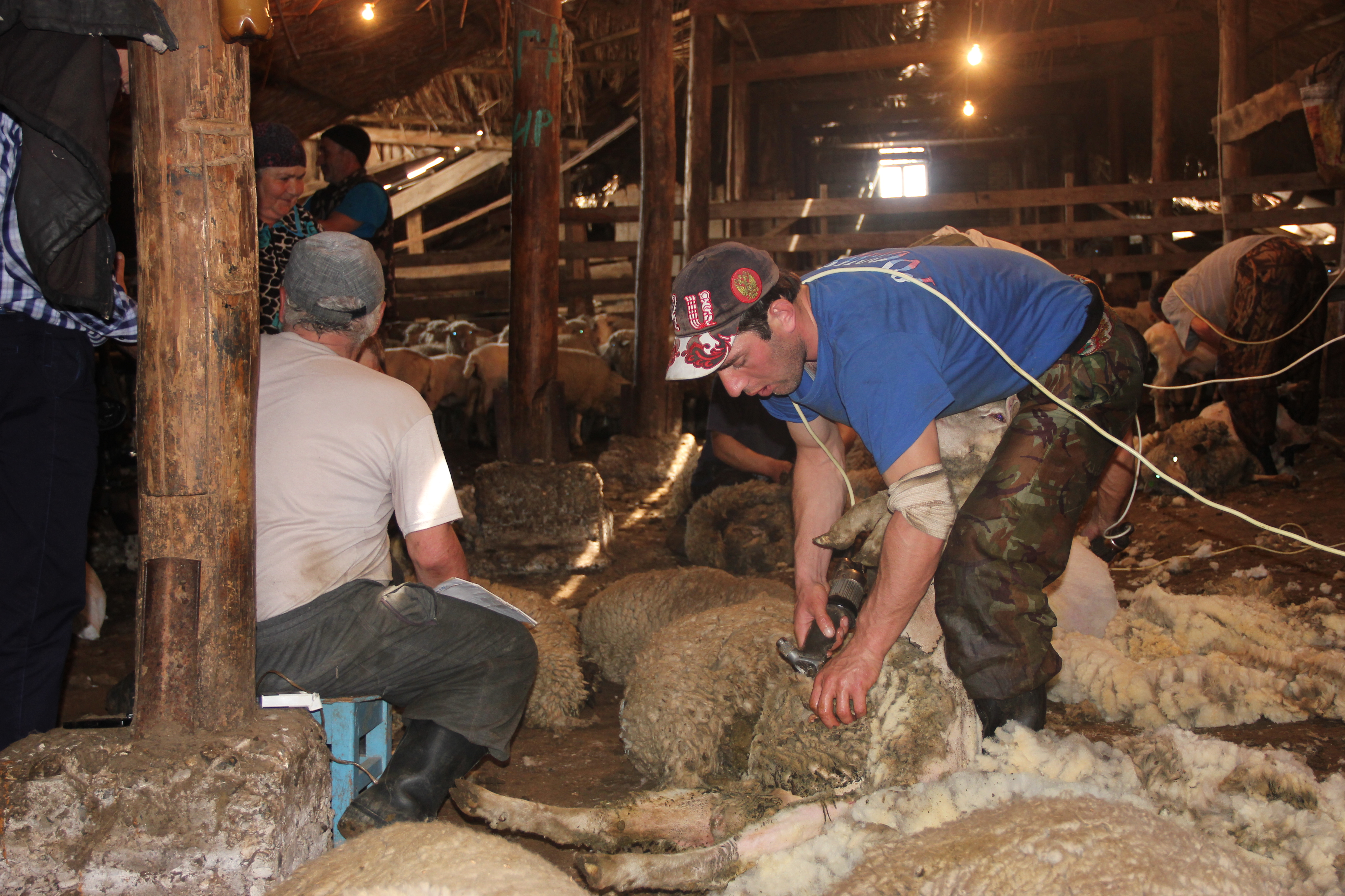 Кампания по стрижке овец здесь идет со 2 мая. Из беседы с заведующим овцетоварной фермой Ибрагимовым Абдурахманом следовало, что стрижке подлежат 488 голов овец, работой занята мобильная группа из 7 человек.
