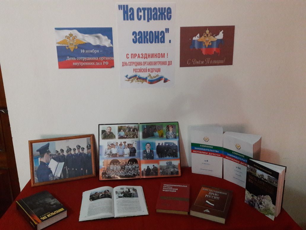9 ноября в читальном зале районной централизованной библиотеки оформлена книжная выставка «На страже закона», приуроченная ко Дню сотрудника органов внутренних дел Российской Федерации. Ее оформила библиотекарь читального зала Наида Шаруханова.