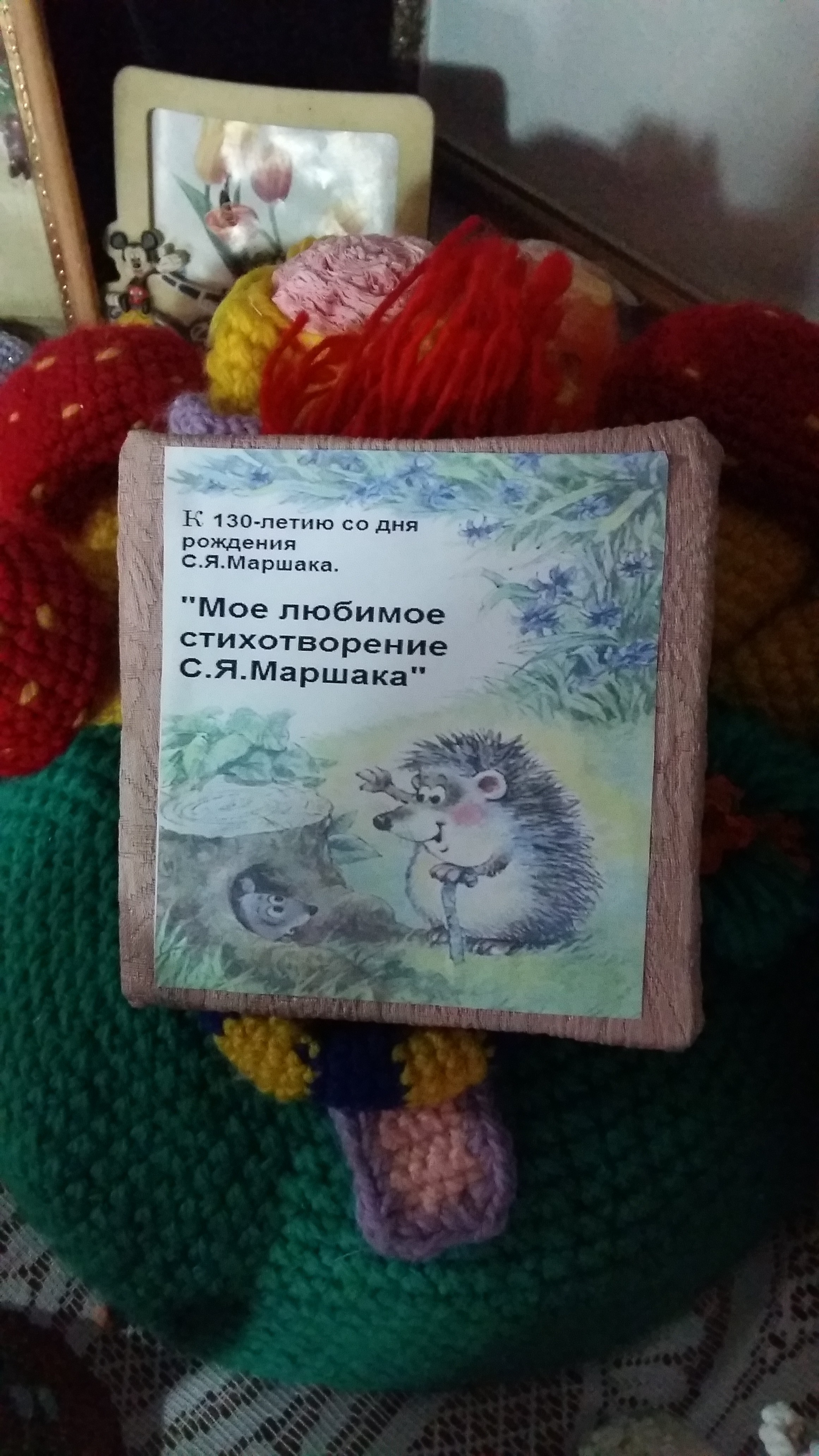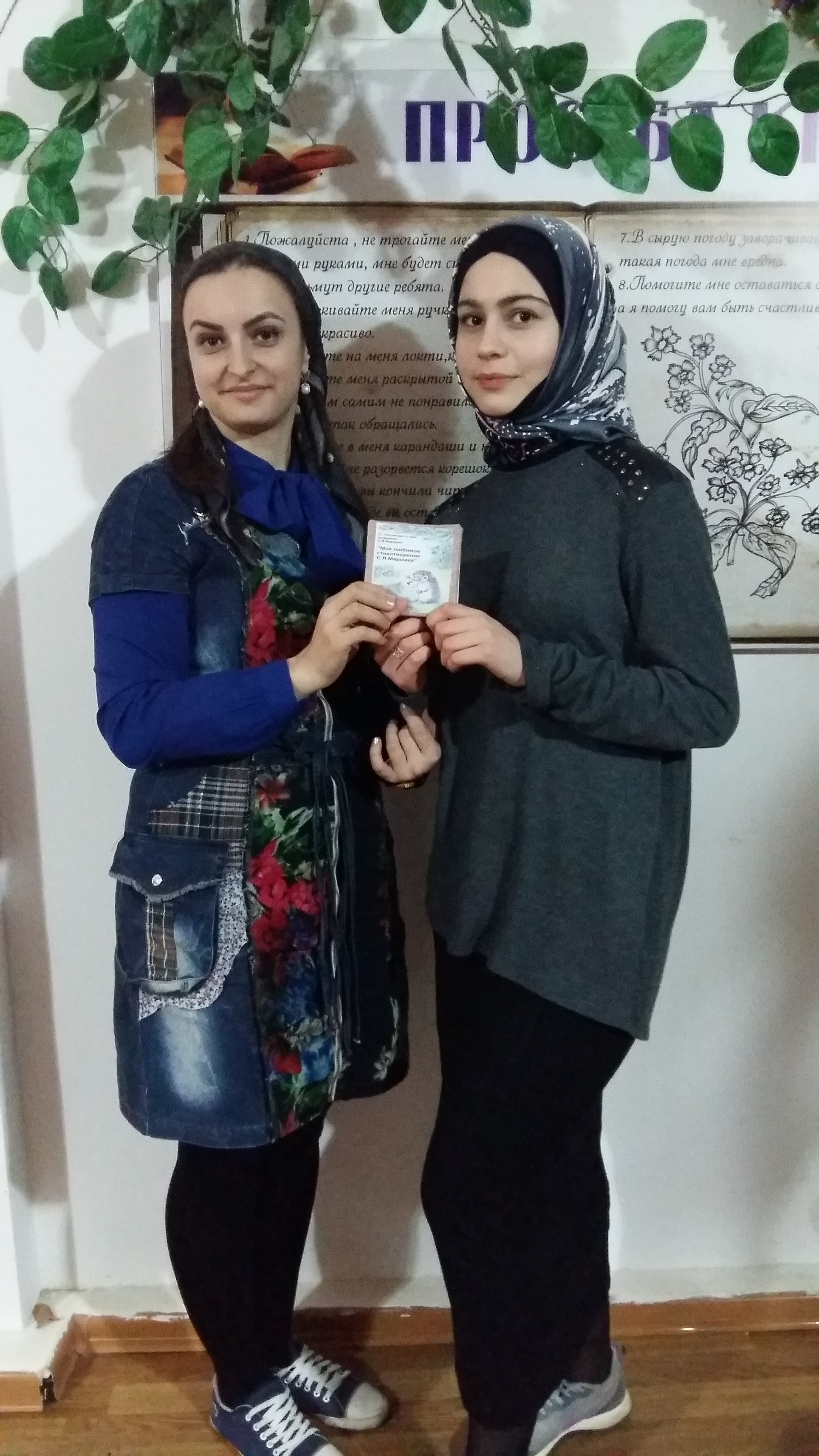 Ученица 10 класса Кизилюртовской СОШ №7 Заграт Идрисова, под руководством заведующей детского читального зала Асият Темиркаевой, изготовила миниатюрную книгу на тему: «Моё любимое стихотворение С.Я.Маршака». В блок 100х100 мм школьница оформила произведение автора и проиллюстрировала его. Тексты, рисунки и переплет выполнены рукой конкурсантки на свое усмотрение.