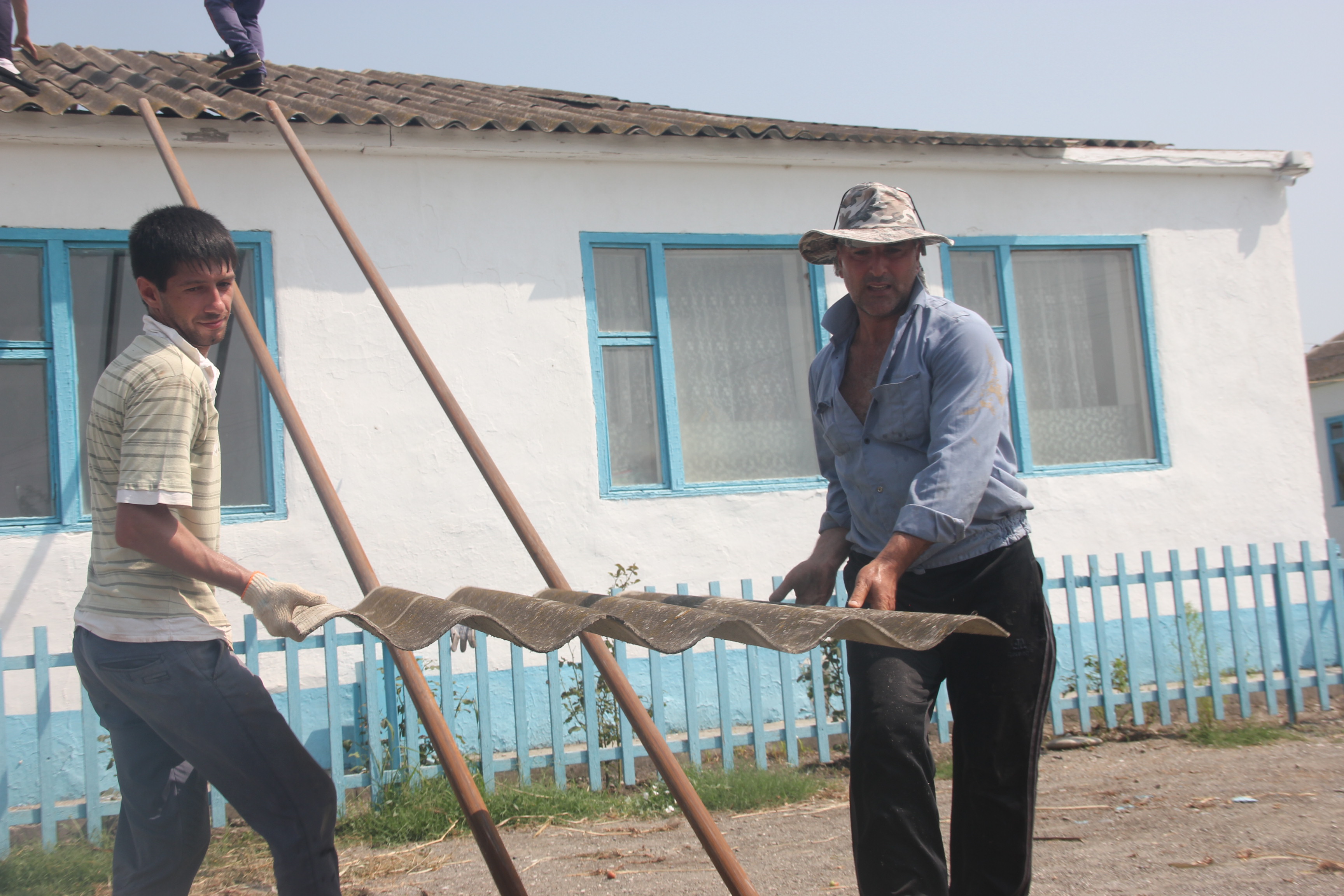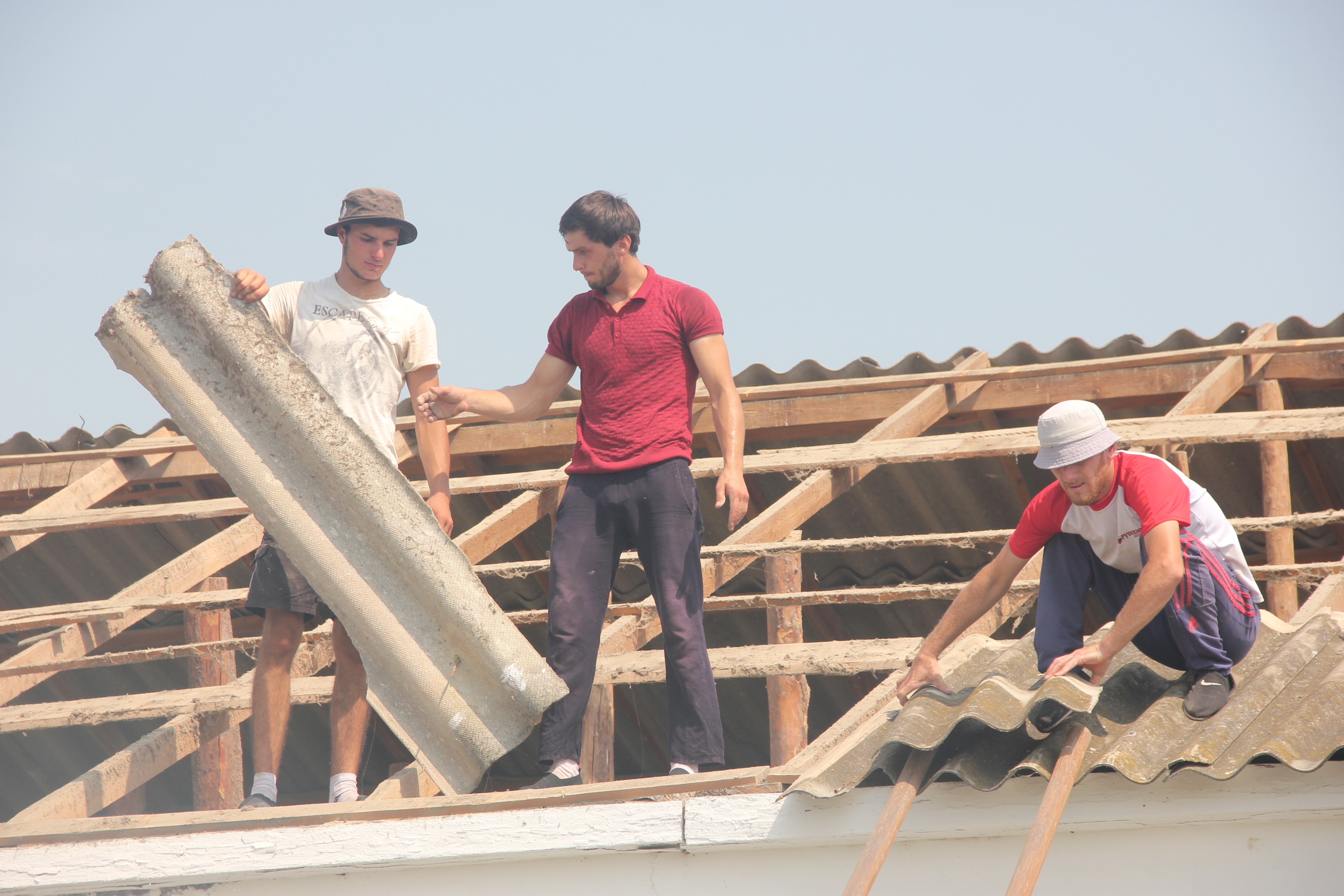 На территории школы уже начались строительные работы. Рабочие приступили к ремонту крыши: сняли старую кровлю и сооружают новую.