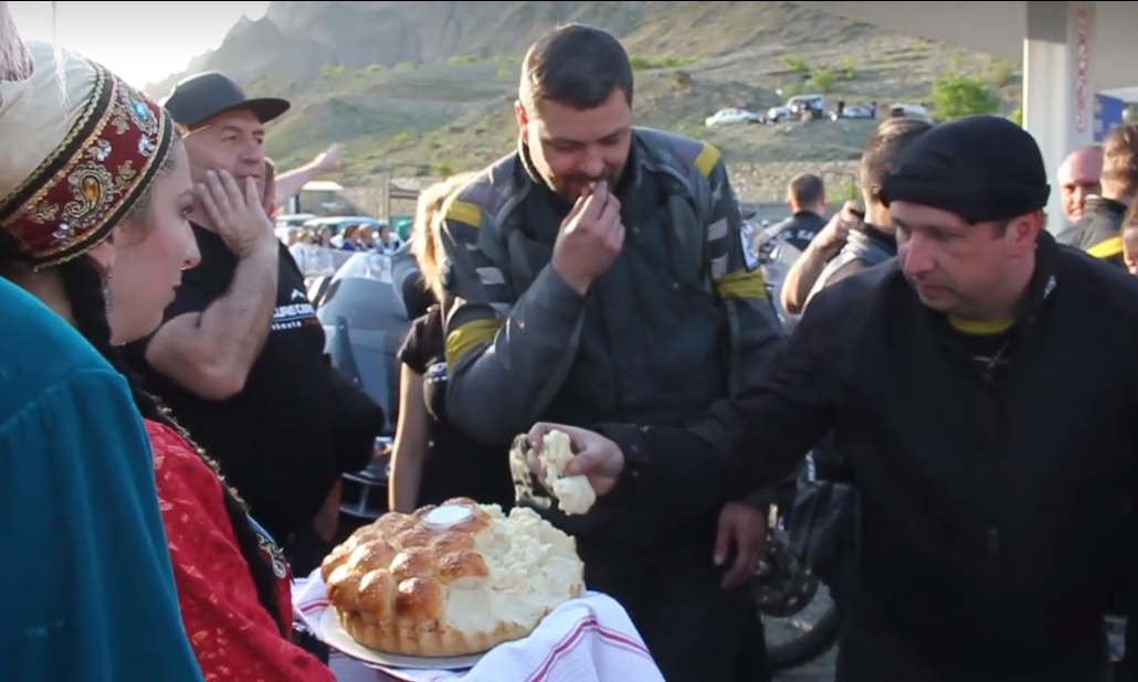 Мототуристы побывали и на территории Гергебильского района. Здесь гостей встретили в торжественной обстановке хлебом – солью. Глава района Рамазан Малачилов поприветствовал участников мототура. «Символично, что акция проходит накануне Дня Победы. Подобные мероприятия объединяют нас и дают мощный заряд позитивной энергии», - подчеркнул он. На фоне величественных гор и знаменитых местных садов национальные танцы в исполнении муниципального ансамбля «Гергебиль» были восприняты всеми с неописуемым восторгом.