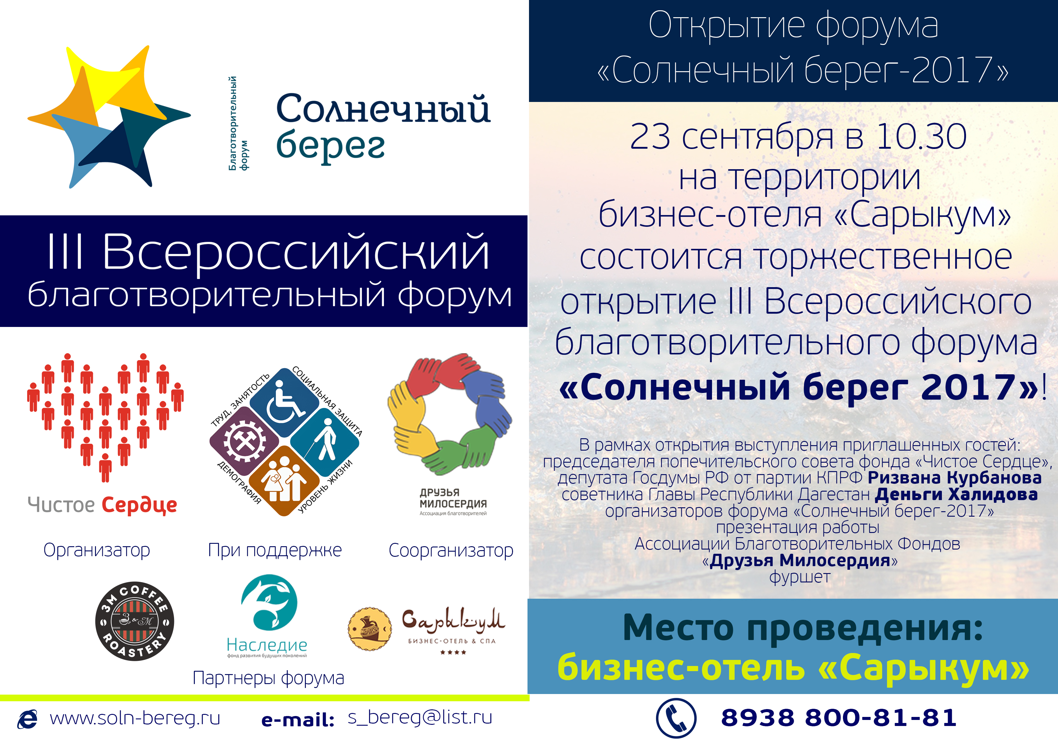 На открытии форума – выступления приглашенных гостей: председателя попечительского совета фонда «Чистое Сердце», депутата Госдумы РФ от партии КПРФ Ризвана Курбанова, советника Главы Республики Дагестан Деньги Халидова, Министра труда и социального развития РД Расула Ибрагимова, заместителя руководителя администрации Главы и Правительства Дагестана Заура Курбанова, организаторов форума «Солнечный берег-2017», презентация работы Ассоциации благотворительных фондов «Друзья Милосердия», фуршет.