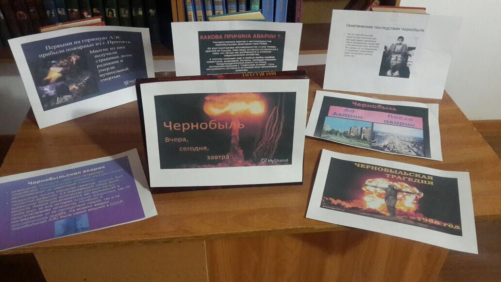 «Чернобыль - быль. Чернобыль - боль», - организовала выставку заведующая отделом абонемента Зубуханова Муслимат. Оказывается, предметы - вещи, техника, мебель - с заражённых мест навсегда сохраняют радиацию и опасны для здоровья человека. Школьникам было представлено содержательное сообщение о самой крупной техногенной радиационной катастрофе в истории человечества.