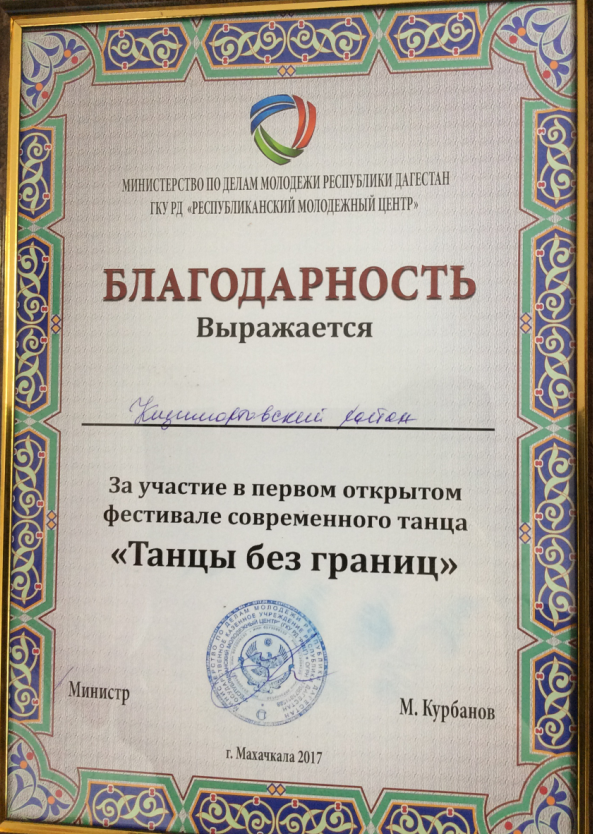 Помимо этого, коллективам сельских культурно-досуговых центров из Кироваула (директору Магомедрасулу Давудову) и Султанянгиюрта (Асият Джанавовой) выразило благодарность за активное участие в первом фестивале современного танца «Танцы без границ» Министерство по делам молодежи Республики Дагестан. (Напомним, фестиваль проходил 9 ноября в Хасавюртовском Центре традиционной культуры народов России «Водник»).