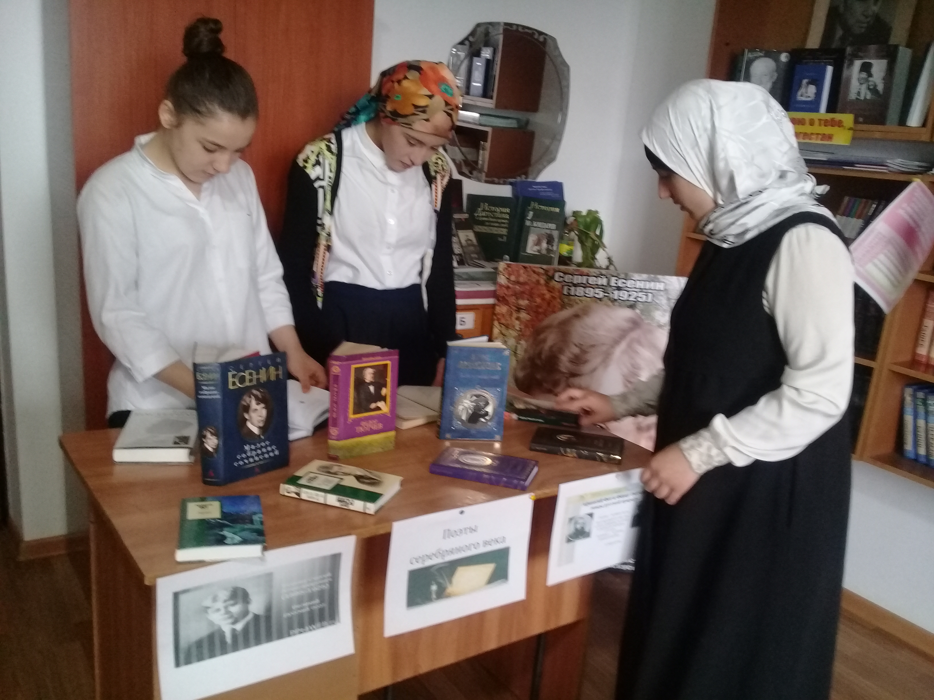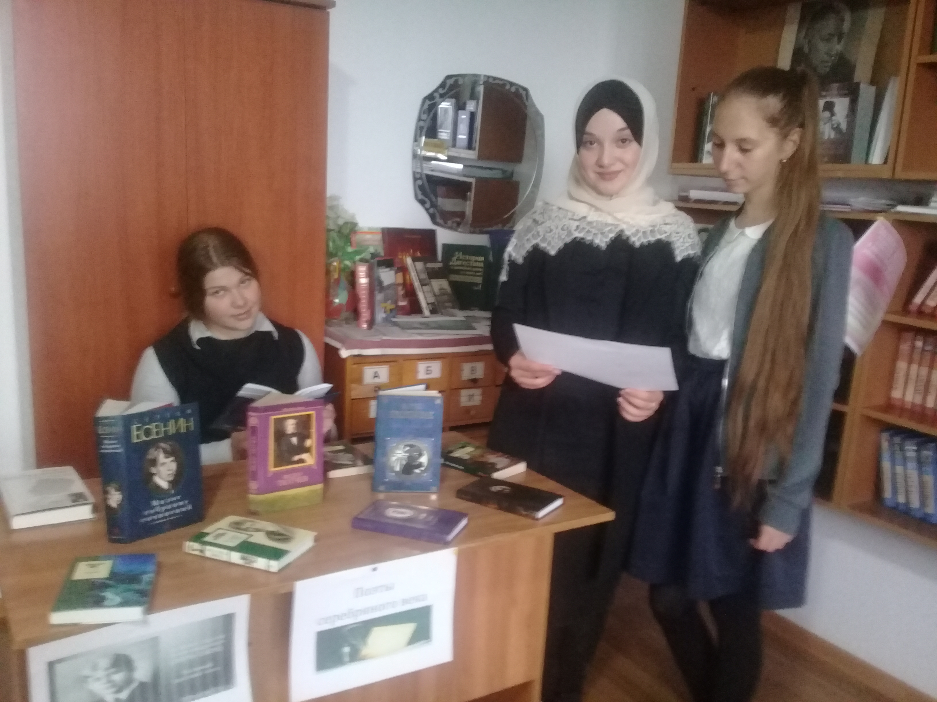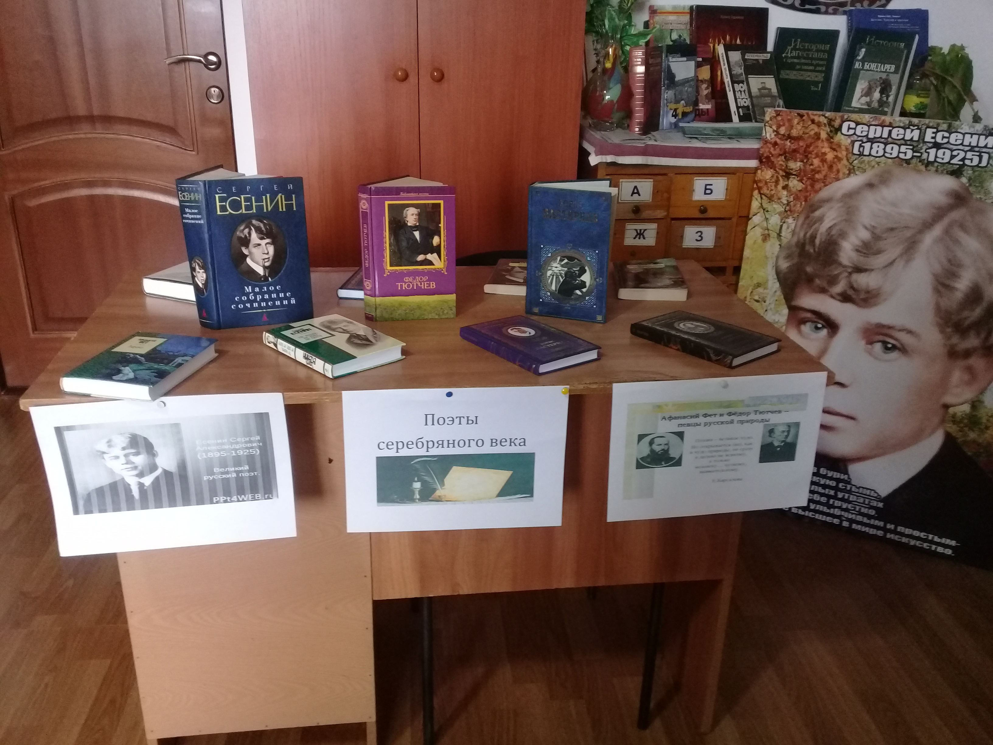 Заведующая взрослым абонементом Зубуханова Муслимат и библиотекарь Насрулаева Айшат организовали беседу с целью заинтересовать учащихся творчеством поэтов серебряного века Ф.Тютчева, А.Фета, С.Есенина и Б.Пастернака, а также расширить знания и кругозор своих читателей.