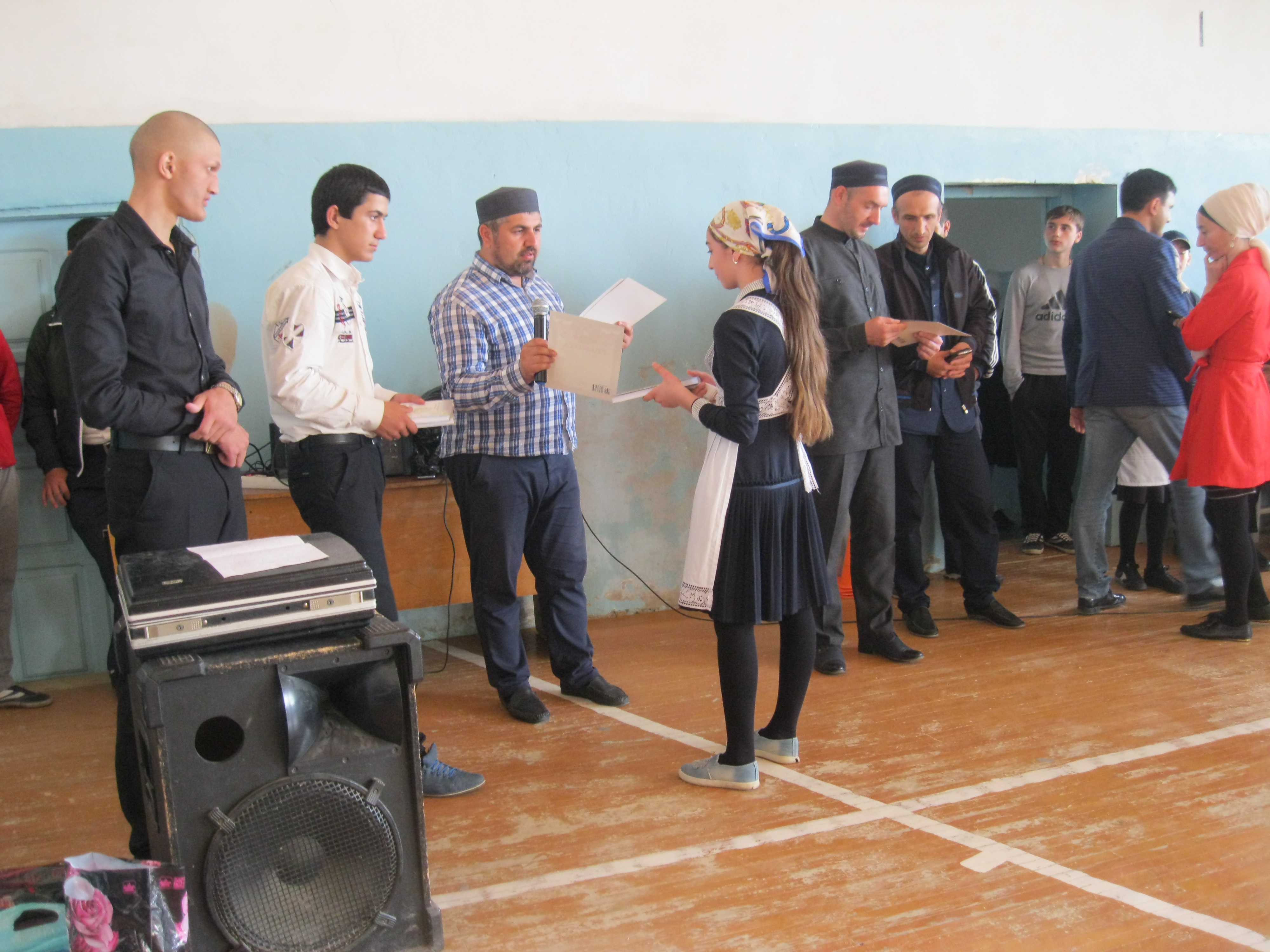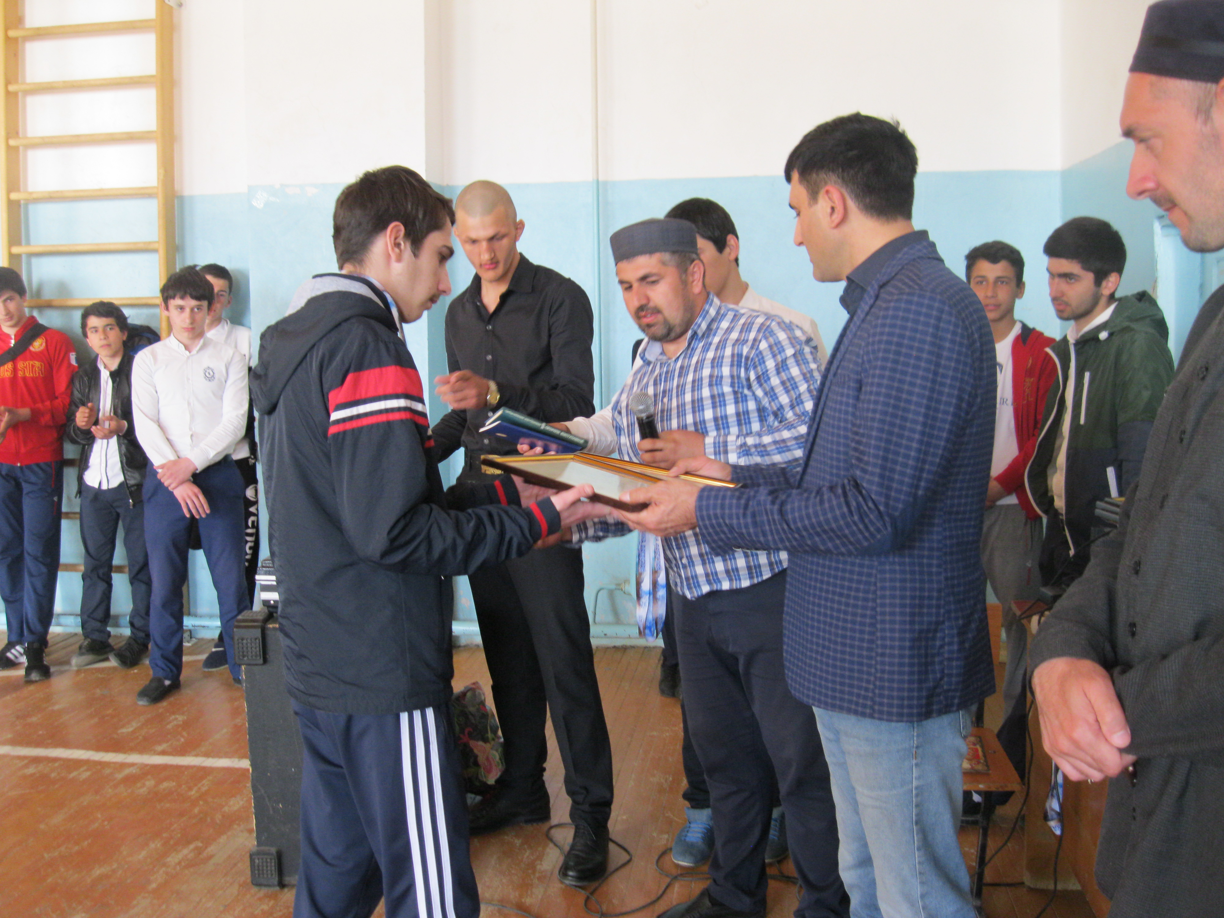 Затем глава села Арсен Шейхов начал церемонию награждения. Из ребят, участвовавших в конкурсе, трое набрали 100 баллов. После награждения ученик 9 класса Хабиб Гаджиев прочитал нашид о Пророке.