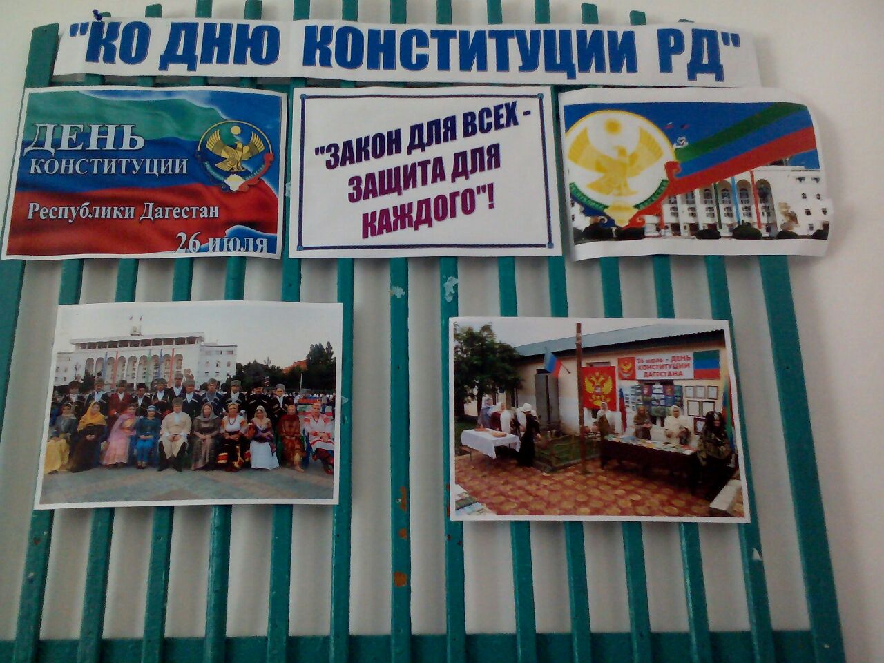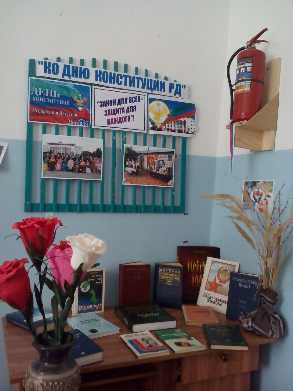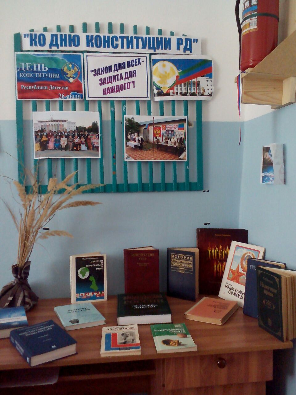 День Конституции Дагестана отмечают во всех уголках нашей республики. В рамках программы «Воспитание патриотизма подрастающего поколения», путем использования Государственных символов России, в сельской библиотеке провели беседу – обзор для юных читателей об основном законе – Конституции Республики Дагестан.
