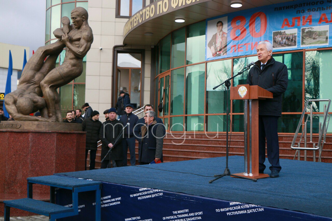 «Сегодня мы открываем памятник прославленному сыну Дагестана, легендарному спортсмену ХХ века, пятикратному чемпиону мира по вольной борьбе, Заслуженному мастеру спорта СССР, Заслуженному тренеру СССР, видному общественному и государственному деятелю, кавалеру орденов Трудового Красного Знамени и «Знак Почета» Али Зулкарнаевичу Алиеву. Радостно сознавать, что это торжественное событие происходит в рамках подготовки к чемпионату Европы по спортивной борьбе, который пройдет в нашей республике весной 2018 года. 29 ноября Али Алиеву исполнилось бы 80 лет. Глядя на этот памятник, участники и гости соревнований вспомнят о блестящих достижениях нашего прославленного борца, пример которого доказывает, что труд и вера в себя помогают осуществить самые смелые мечты», - сказал Владимир Васильев, открывая значимое для республики мероприятие.